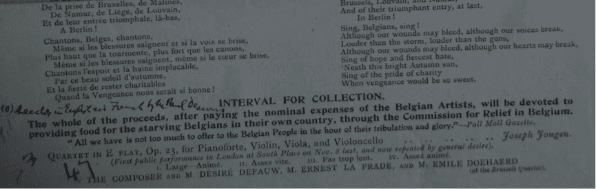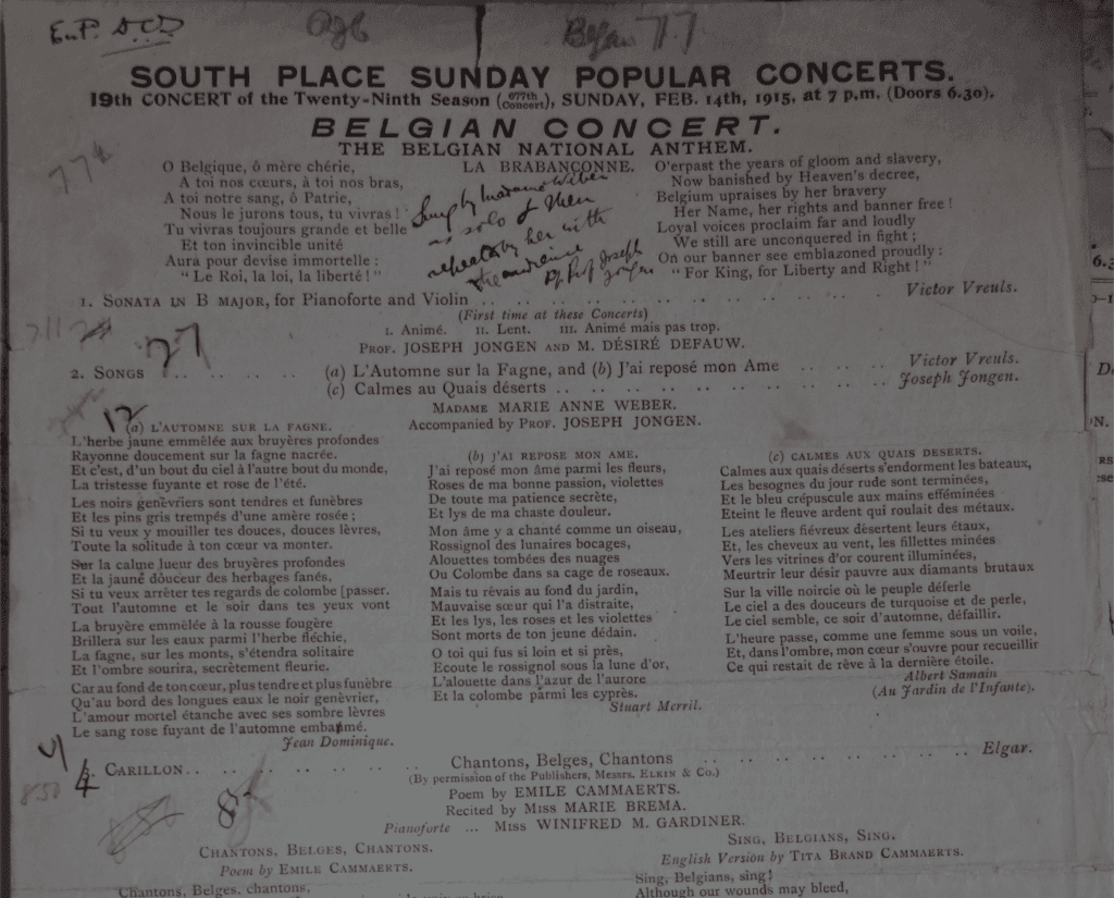 The same year as this concert, Rebecca Clarke, now best known for her viola compositions, joined the group of women who performed at the South Place concerts for the first time during world war one. At a later concert she returned to play alongside Marcel Laoureux, a pianist to the Belgian Court, and MM. Desire Defauw, a Belgian violinist and conductor. The singer in the concert was M. A. Coryn, director of the Royal Opera, Antwerp. Whilst this was not another concert raising money to support refugees, it was clearly an effort to show support to Belgium during the war.