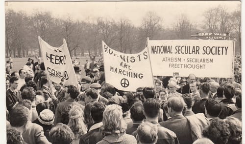 National Secular Society members and Humanists protesting on Easter Monday in Hyde Park, c.1970