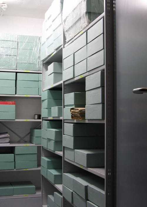 Once empty the room was gutted and repainted, the raw concrete floor sealed and a fireproof door installed. Archive quality steel shelving was erected, specified to accommodate the archive boxes in the most space efficient way. At the time of writing the room is ready and, with reboxing well advanced it is hoped to move all the collections in by April 2013.