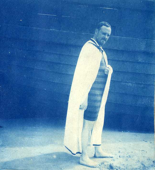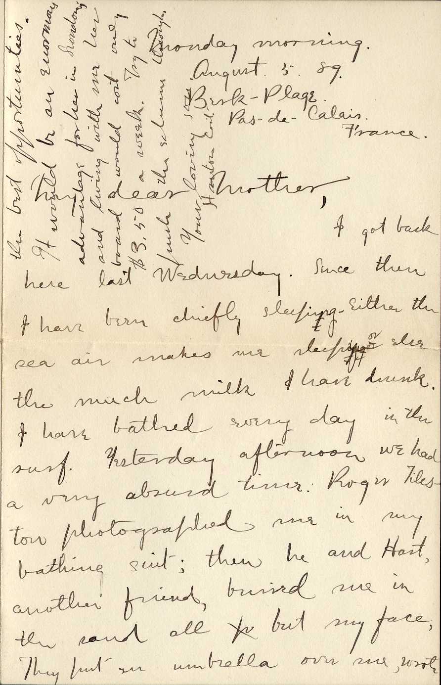 Yesterday afternoon we had a very absurd time. Roger Tileston photographed me in my bathing suit; then he and Hart, another friend, buried me in the sand (all but my face). They put an umbrella over me with an inscription on the sand and photographed me with my eyes shut. The photograph (of which I saw the negative) looks too ghastly for anything; so that I am in doubt whether I shall send you a copy when they are finished. But the others you shall have.