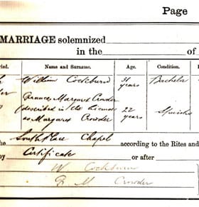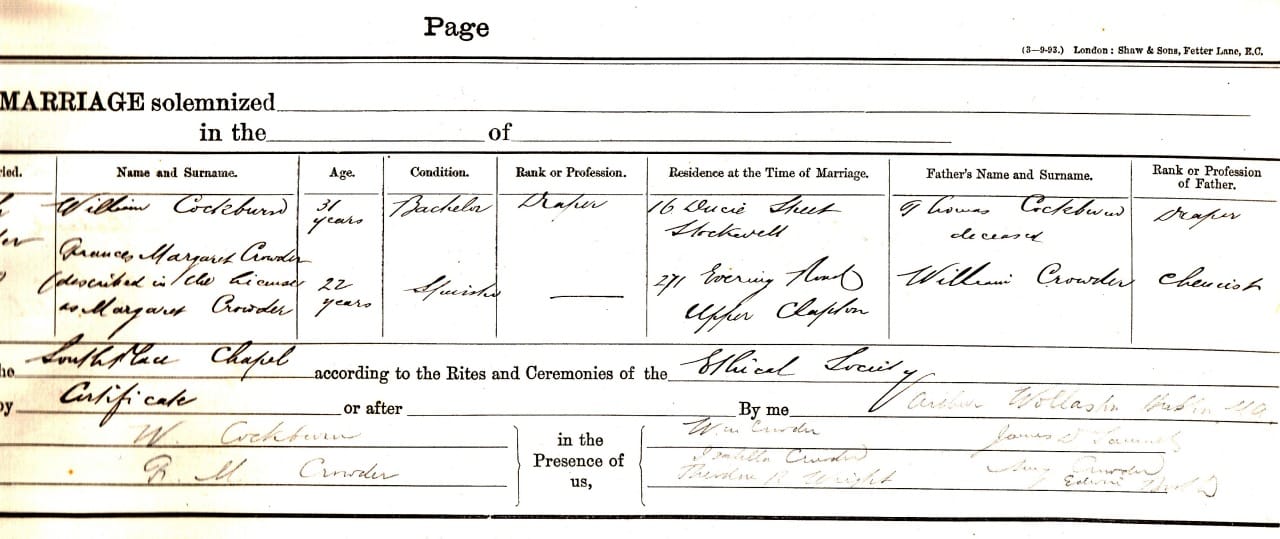 The earliest surviving record of a marriage at South Place is that of William Cockburn of Stockwell, and Frances Margaret Crowden of Upper Clapton. The ceremony took place in the old chapel on 10 December 1880.