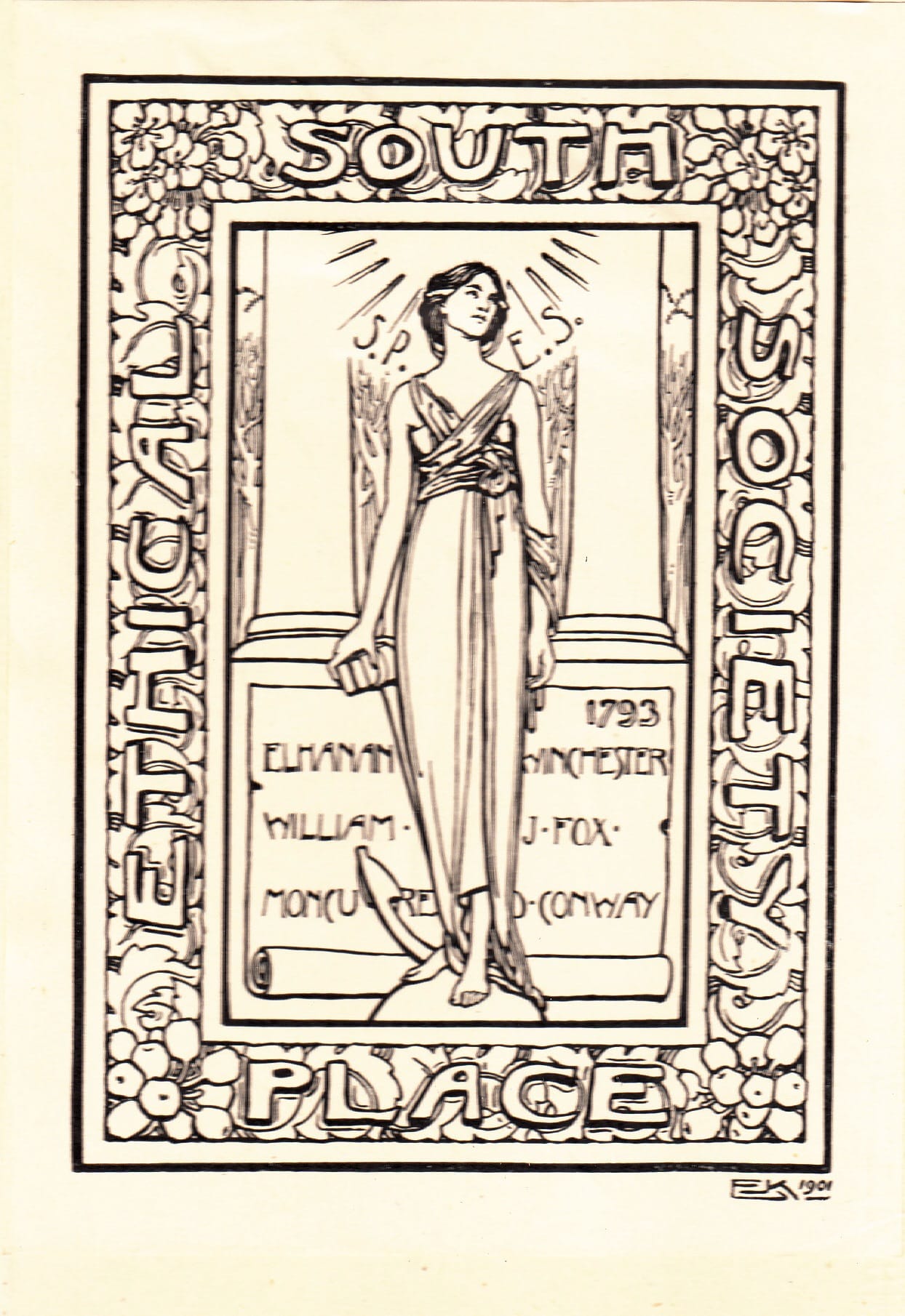 “When the Library re-opens on Sunday, September 8th, copies of the book-plate, specially designed by Miss Ethel Kendall, will be found inserted in all the books. An emblematical figure of Hope, suggested by the initials of our Society, S.P.E.S., occupies the centre of the design-one hand rests on an anchor, and behind is a scroll bearing three names of paramount importance in the history of the Society. The Society’s full name appears in the border, which bas a conventional background of flowers and fruit. It is hoped that the design will meet with general approval.”