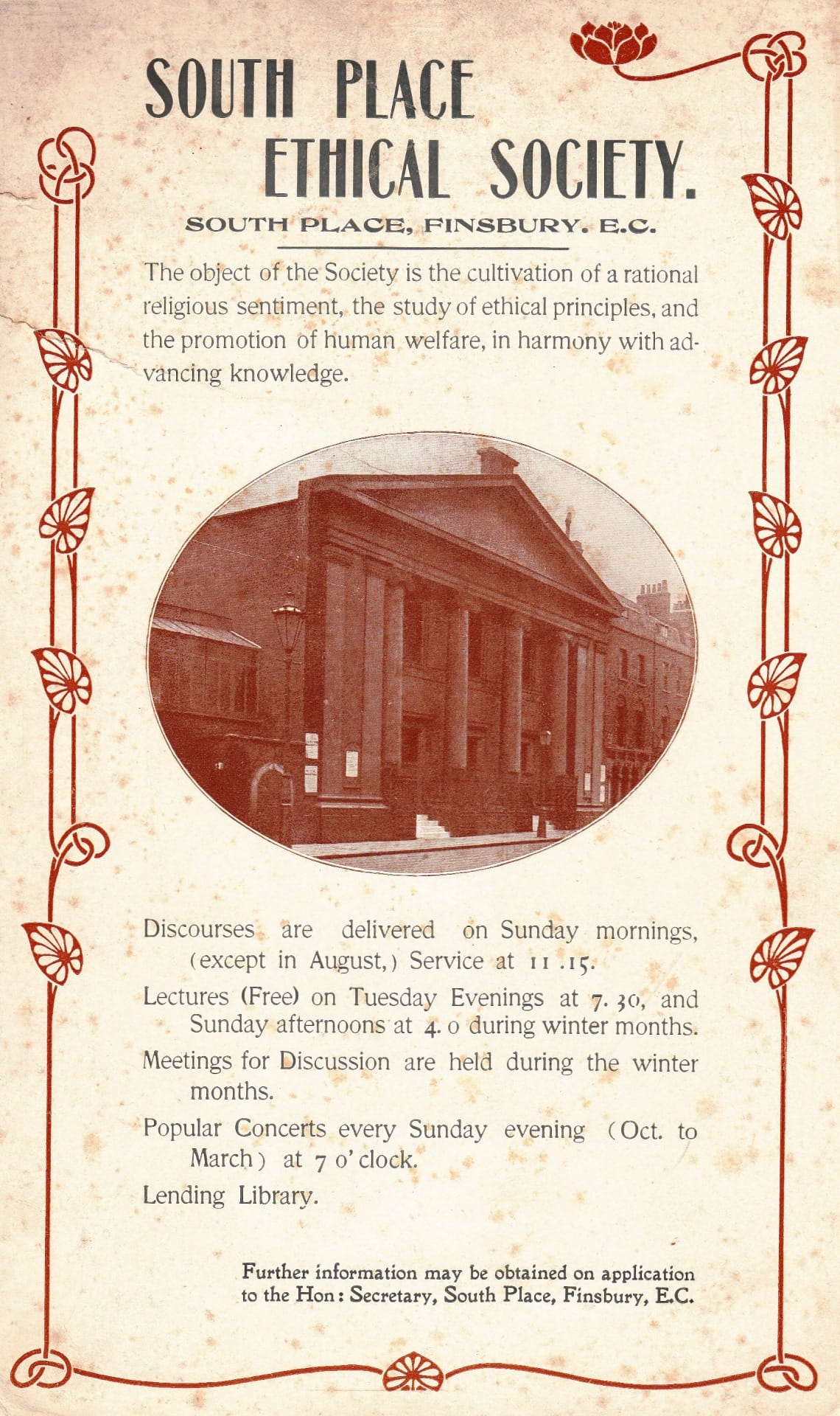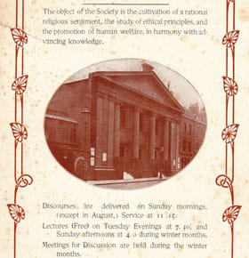 Conway Hall Ethical Society has a long history of running public lectures, discussions and a library service. This advert from their former home at South Place, (c.1910) highlights a continuity at the heart of the Society. Although a wider variety of topics are discussed at the Society’s events today, Sunday Lectures and Sunday Concerts retain a prominent position in the Society’s calendar.