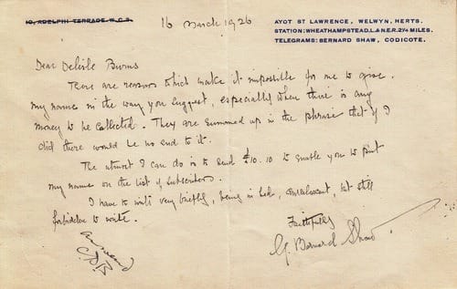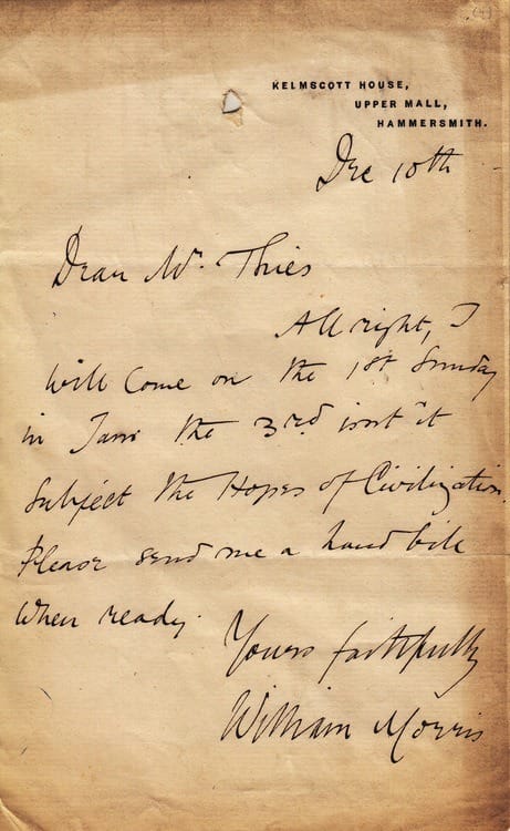 In these letters from the Society’s archive William Morris confirms that he will give a talk on ‘the hopes of civilisation’ and George Bernard Shaw agrees to have his name added to the list of subscribers.