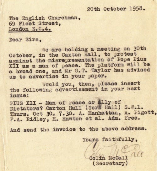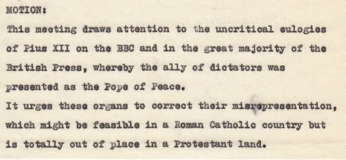 Celebrated nationally as the ‘Pope of Peace’, the National Secular Society were alarmed by the uncritical reporting of Pius’ leadership. For the Society, the Pope’s actions between 1935-1958 could easily be interpreted as befriending dictators rather than promoting non-violence.