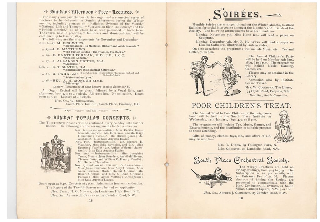 Notable leaders of the Society include renowned orator William Johnson Fox who became minister in 1817. His popularity, resulting in an increase in the congregation, led to the construction of their first purpose built home, South Place Chapel in Finsbury, into which the congregation moved in 1824. Among the congregation and its close kin was a circle of radicals and progressive thinkers who stood for various political and social causes, including women’s rights, suffrage and education for all. These included women’s rights advocates Sophia Dobson Collet and Caroline Ashurst Stansfield, poet Robert Browning, philosopher John Stuart Mill, social theorist Harriet Martineau as well as adherents of William Lovett and Chartism.