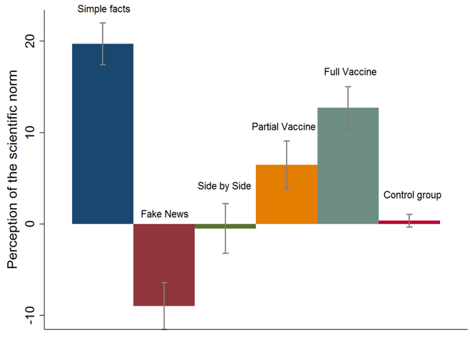 Essentially, we found that when we just communicated the simple fact to people that 97% of climate scientists have concluded that global warming is happening, most people shifted their perceptions in line with the science (blue bar). As expected, when we exposed people to the false petition, they shifted away from the conclusions of climate science (red bar). When exposed people to both stories side by side (reflecting the current media environment), the misinformation completely cancelled out the facts (green bar), highlighting the potency of fake news. In the inoculation conditions, we preemptively warned people that there are political actors who use misleading tactics to try to mislead the public (partial vaccine, orange bar) and we explained (in advance) that the petition contains false signatories (e.g. Charles Darwin). In both groups, people were much less influenced by the misinformation, preserving about one third and two thirds of the “facts”. What’s promising is that we observed these patterns across the political spectrum, reducing group polarisation.