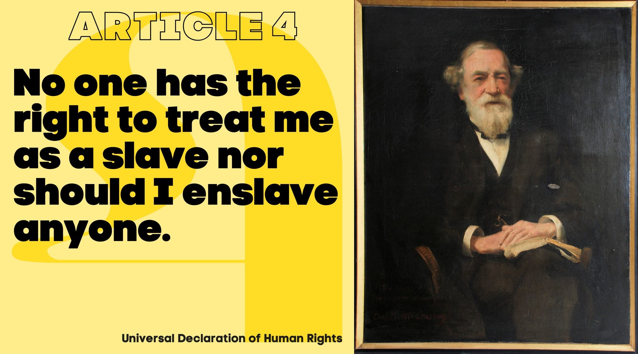 The right not to be enslaved is enshrined in Article 4. Our namesake Moncure Conway, whose personal library forms a significant part of our pamphlet collection, was a noted abolitionist campaigner. Born into a Virginian slave-owning family, Conway freed his father’s slaves during the American Civil War. He was well-known for his public speaking on the topic of anti-slavery and many of his lectures and sermons were reproduced as pamphlets. When Conway first came into contact with our Ethical Society (then a non-conformist Unitarian congregation), he was on a speaking tour of Britain, aiming to persuade the British people of the Union cause.