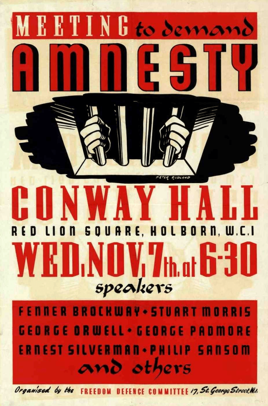 On 3 November 1945, the anarchist newspaper Freedom advertised a meeting organised by the Freedom Defence Committee to “Demand Amnesty”, to take place at Conway Hall on 7 November. In addition, a wonderful coloured poster was issued, designed by Peter Rudland, a prolific book illustrator and advocate of improved handwriting. A number of speakers were listed, among them George Orwell. But what was the Freedom Defence Committee? Who were the other speakers? And whose amnesty were they demanding?